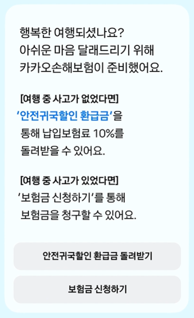 카카오페이 여행자보험은 안전 귀국 환급금 제도를 운영하고 있어 무사히 귀국하면 보험료의 10%를 환급받을 수 있습니다.