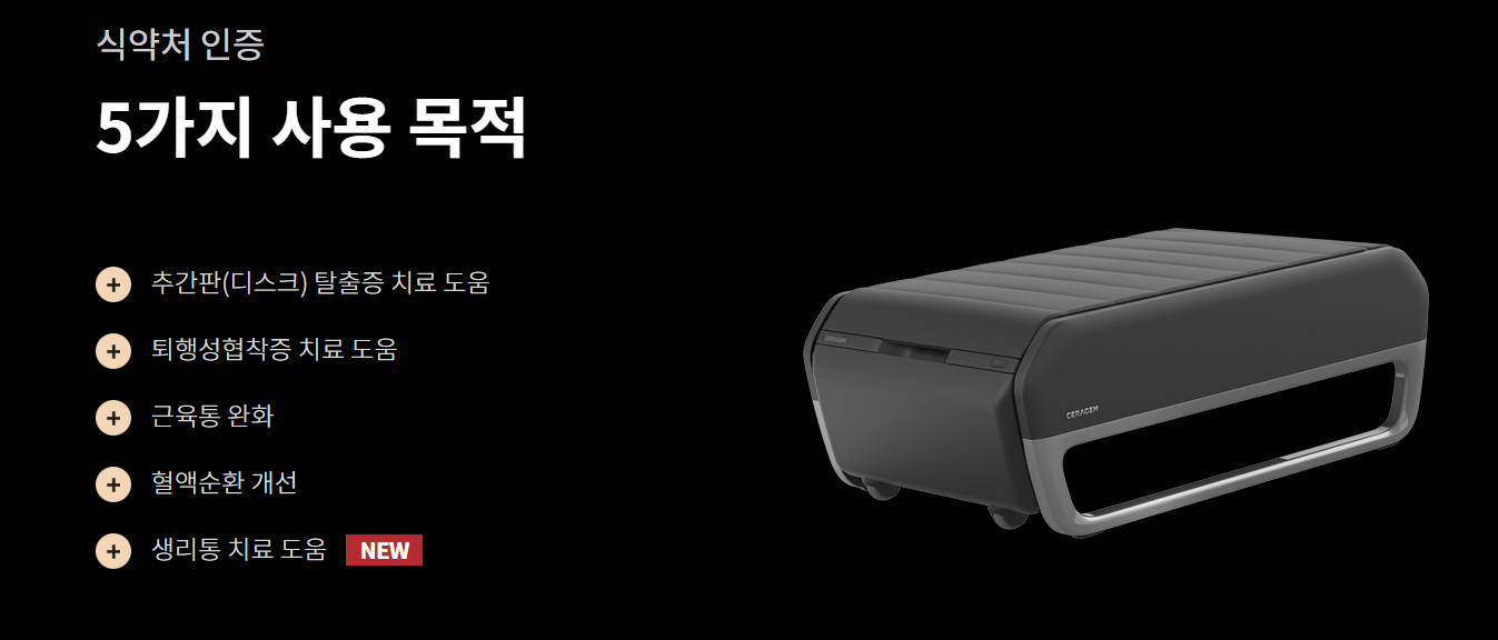 특히 세라젬 V6와 V7DMS 열을 전달하고 물리적 힘을 가하여 근육통 완화, 혈액 순환 개선, 생리통 치료 등에 사용됩니다.
