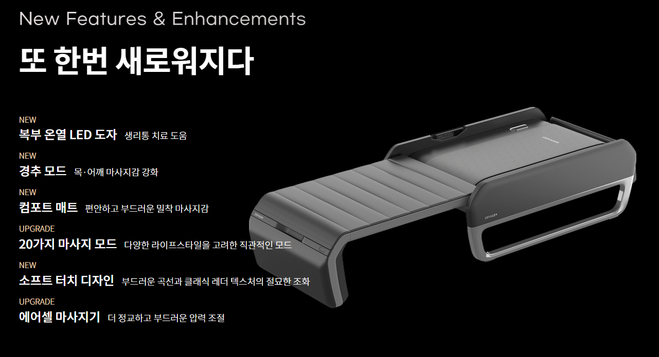 세라젬 V7은 식약처 인증 5가지 사용목적 인증을 받은 제품으로, V6의 기능에 더해 생리통 치료에도 도움이 되는 기능이 추가되었습니다.