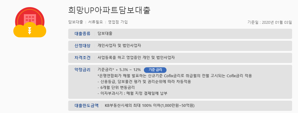 아파트를 담보로 제공할 수 있어야하며, 신용등급 및 사업장 매출액, 기존 부채금액 등에 따라 대출신청이 거부될 수 있으니 유의바랍니다.