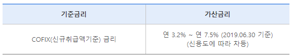 기준금리는 시장고시금리로 결정되며,  가산금리는 본인의 신용등급에 따라 연간 3.2%에서 연간 7.5% 사이로 책정될 수 있습니다.