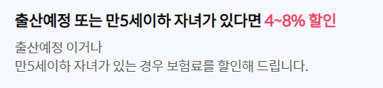 두번째는 태아 및 만5세 이하의 자녀가 있는 경우 4~8%의 보험료를 할인해주는 자녀사랑 특약입니다.