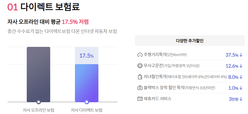 설계사 중간마진이 없어 오프라인 대비 평균 17.5% 낮게 보험료가 책정된 다는 것이 가장 큰 메리트입니다.