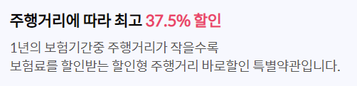 끝으로 년간 주행하는 거리에 따라 최고 37.5%의 보험료를 인하받을 수 있는 주행거리 할인 특약이 있습니다.