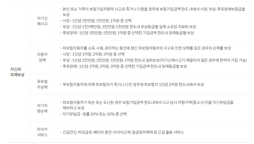 또한 무보함차상해 및 자기차량손해, 마이카서비스 등을 이용할 수 있으니 참고하시길 발바니다.