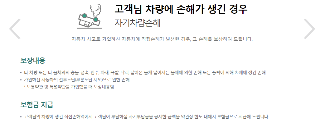 타 차량 또는 타 물체와의 충돌, 침수, 화재, 폭발, 낙뢰 등으로 은해 손해가 생긴 경우에 가입한 금액만큼 피해를 보상받을 수 있습니다.