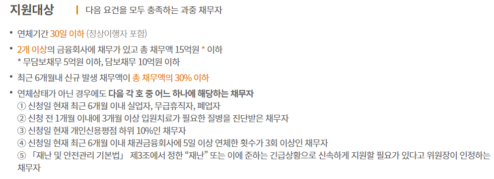 2개이상의 금융회사에 채무가 있고 총 채무액이 15억원 이하, 최근 6개월 내 신규 발생 채무액이 총 채무액의 30% 이하인 경우 신청할 수 있습니다.