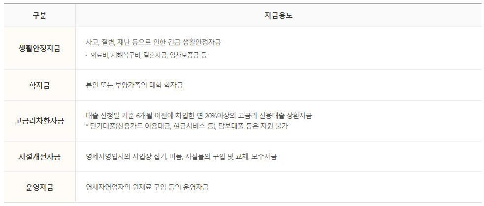 - 생활안정자금 : 사고나 질병, 재난 등으로 인한 긴급 생활안정자금이 이에 해당합니다.