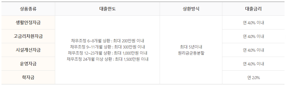 대출금리는 생활안정자금, 고금리차환자금, 시설개선자금, 운영자금은 연 4.0% 이내로 적용되며, 학자금의 경우에는 연 2.0%의 금리가 적용되니 참고 바랍니다.