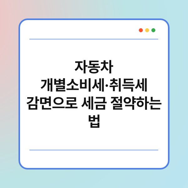 자동차를 구매할 때, 세금이 부담스럽다고 느끼신 적 있으신가요? 특히 개별소비세와 취득세는 큰 비용으로 작용할 수 있습니다. 하지만 이런 세금을 절약할 수 있는 방법이 있다는 사실, 알고 계셨나요? 이번 글에서는 자동차 개별소비세와 취득세 감면으로 세금을 절약하는 법에 대해 자세히 알아보겠습니다. 세금 절약을 통해 더 나은 자동차 구매를 꿈꾸는 여러분을 위해 유용한 정보를 제공할게요.