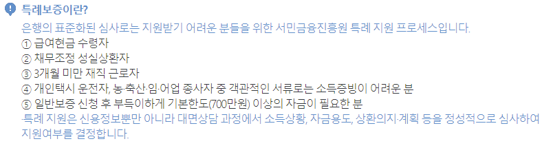 특례보증은 햇살론15 취급은행의 표준화된 심사로는 지원을 받기 어려운 분들을 지원하기 위한 서민금융진흥우너 특례지우너 프로세스로 급여현금수령자 및 3개월 미만 재직근로자, 일반보증 신청후 부득이하게 700만원 이상의 자금이 필요한 분 등이 이용할 수 있으니 참고바랍니다.