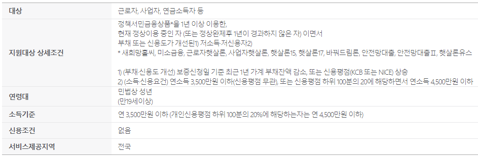 - 저신용자 : 개인신용평점 하위 20%에 해당하면서 연소득이 4500만원 이하인 분