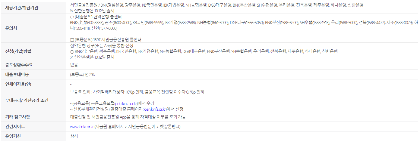 서민금융진흥원 햇살론뱅크 취급기관은 경남은행, 광주은행, 국민은행, 기업은행, 농협은행, 대구은행, 부산은행, 수협은행, 전북은행, 하나은행, 신한은행입니다.