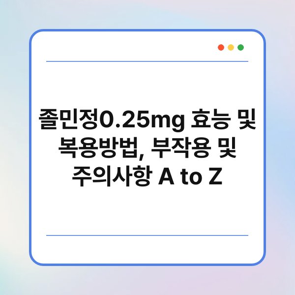졸민정 0.25mg, 이 약을 들어보신 적 있으신가요? 불면증이나 불안장애로 힘들어하시는 분들에게 도움이 될 수 있는 이 약물의 효능과 복용방법을 함께 살펴보겠습니다. 하지만 어떤 약이든 부작용과 주의사항이 중요한데요, 졸민정 또한 예외는 아닙니다. 여기서는 졸민정의 효과, 복용 방법, 부작용 및 주의사항을 A to Z로 정리해 드릴게요. 끝까지 읽고 유용한 정보를 챙겨가세요!