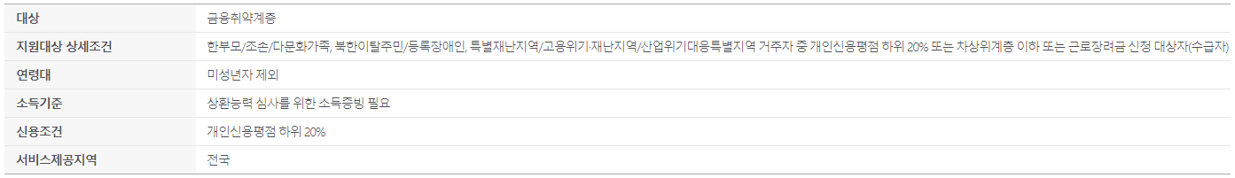 한부모, 조손, 다문화가족, 북한이탈주민, 등록장애인, 특별재난지역, 고용위기 재난지역, 산업위기 대응특별지역 거주자가 아래의 요건 중 하나를 만족하면 대출 신청이 가능합니다.