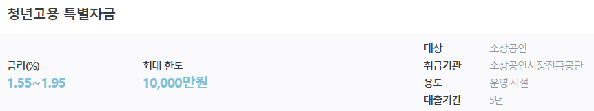 소상공인시장진흥공단에서는 대표자가 만 39세 이하의 청년ㄴ이거나 청년 근로자를 고용중인 경우 사업운영자금 또는 시설자금 용도로 저금리의 대출을 지원하고 있습니다.