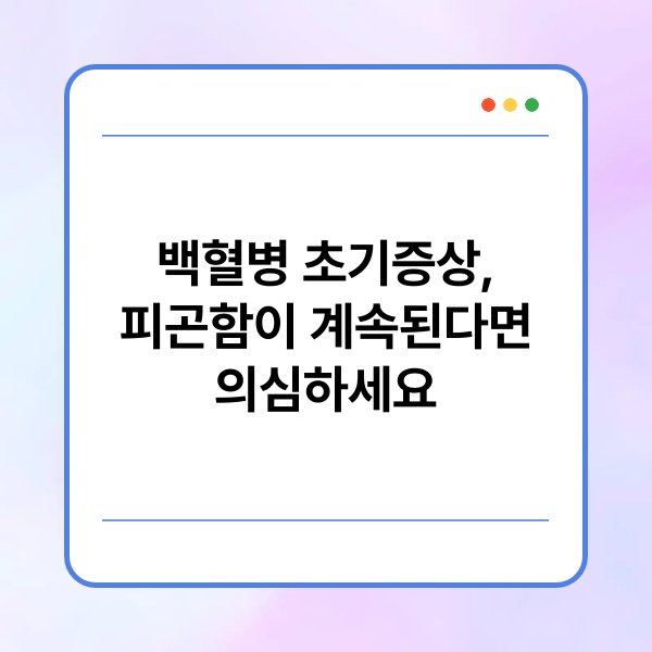 피곤함 외에도 백혈병의 초기 증상으로는 체중 감소, 잦은 감염, 출혈 경향 등이 있습니다. 이러한 증상을 무시하지 말고, 일상적인 변화에 주의 깊게 관찰해야 합니다. 만약 피곤함이 지속된다면, 다른 증상과 함께 의료기관을 방문하여 상담을 받는 것이 중요합니다.