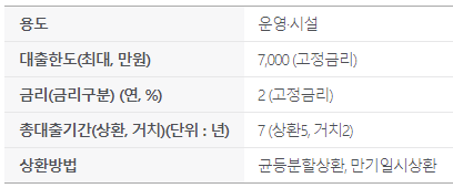 대출기간은 총 7년으로 이중 대출초기 2년은 거치기간으로 활용되고 나머지 5년간 원금과 이자를 분할하여 대출금 상환이 진행되니 참고하시길 바랍니다.