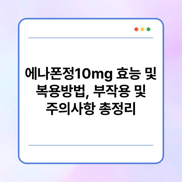 에나폰정 10mg의 복용 방법은 매우 간단합니다. 일반적으로 의사의 처방에 따라 하루 1~3회 복용하게 됩니다. 물과 함께 복용하며, 먹는 시간은 일정하게 유지하는 것이 좋습니다. 이는 약의 효과를 극대화하는 데 도움을 줍니다.