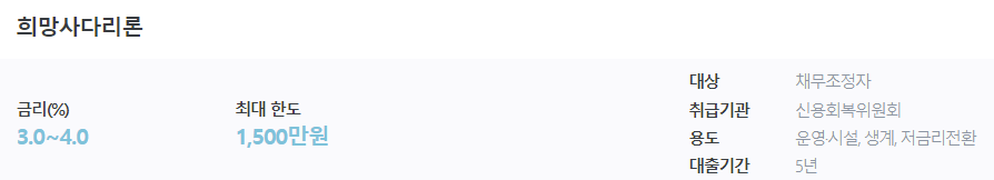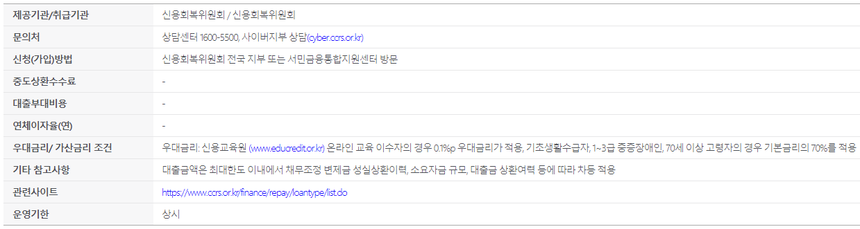 개인신용평점이 좋지 않아도 신청할 수 있지만 현재 연체중이거나 무직자인 경우에는 대출 신청이 불가할 수 있으니 보다 자세한 지원대상 요건은 신용회복위원회 상담센터로 문의하시길 바랍니다.