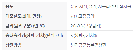 대출기간은 총 5년이며, 대출초기 상환금 부담을 줄여주는 거치기간은 부여할 수 없고 원리금균등분할상환의 방식으로 대출금 상환이 진행되니 참고하시길 바랍니다.