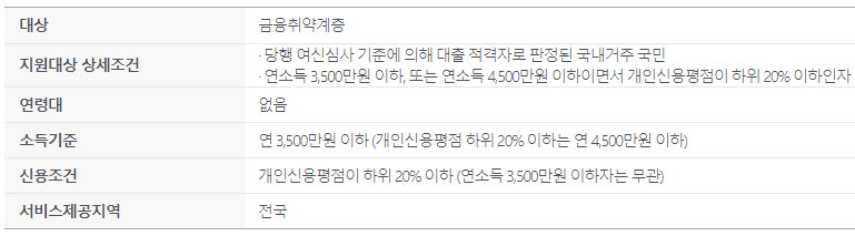 - 연소득 4500만원 이하이면서 개인신용평점이 하위 20%에 해당하는 분