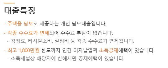 감정료 및 타사말소비, 설정비 등 각종 수수료가 면제되어 수수료부담이 없으며 최고 1800만원 한도까지 연간 이자납입액 소득공제 혜택을 받을 수 있는 것이 특징입니다.